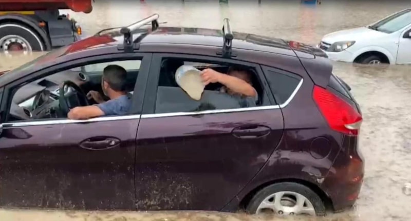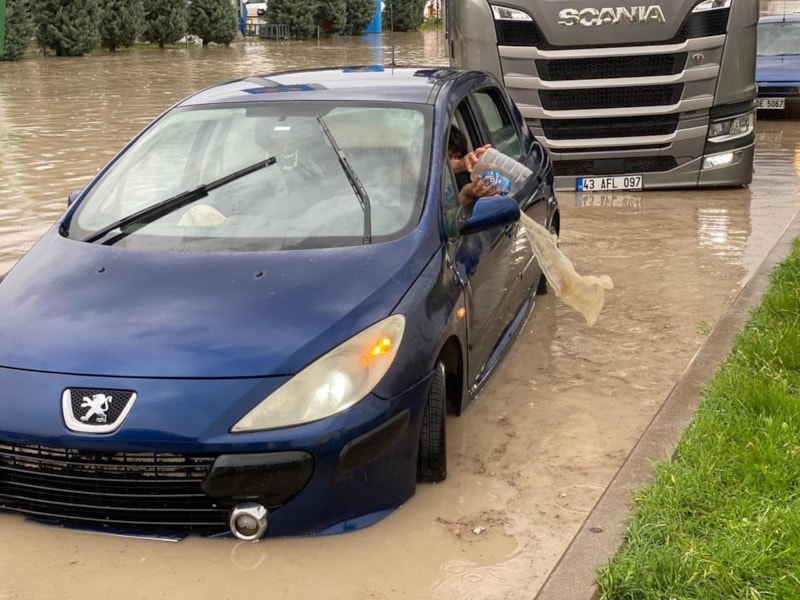 Sürücüler ve vatandaşlar, araçların içindeki suyu pet şişelerle boşaltmaya çalıştı.