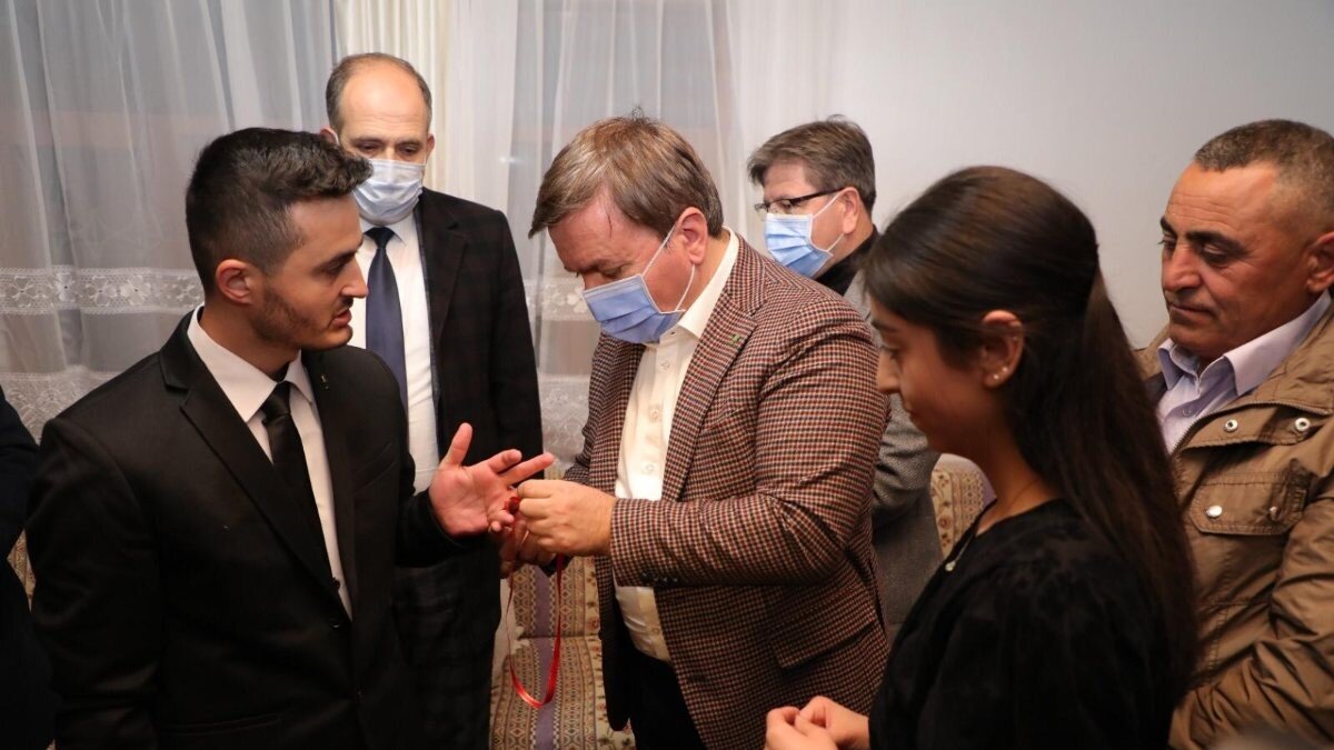 Vali Hamza Aydoğdu, “Engin kardeşimizin babası küçükken vefat etmiş, annesi de yurtdışında başka bir evlilik yapmış. Tabi kendisi güvenlik görevlisi, Burcu kızımızla evlenmek istediğini bildirdi. Ailesi olmadığı için de Sayın Valim bize aile büyüklüğü yapar mısınız? Biz bir birimizi seviyoruz deyince bizde araştırdık. Hakikaten kimsesi yok. Onun için bizde arkadaşlarımızla beraber müftümüz, özel idare sekreterimiz ve milli eğitim müdürümüz ile aynı zamanda muhtarımızla birlikte eve geldik. Burada gördüğünüz gibi sağ olsun Burcu kızımızın anne ve babası bizi çok iyi ağırladı. Kız isteme merasimini gerçekleştirdik. Yüzüklerimizi taktık. Bir kardeşimizin bizi ailesi görmesi, bizi birim amirlerimizi kendine yakın hissetmesi, ailesinden bir parça görmesi bizim için çok değerli. Biz böyle kardeşlerimize inşallah hep birlikte sahip çıkacağız. Böylece el birliğiyle gönül birliğiyle samimiyet içerisinde bir yuvanın temellerini attık” dedi.