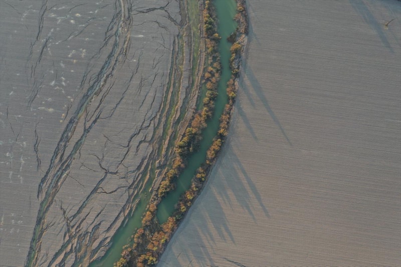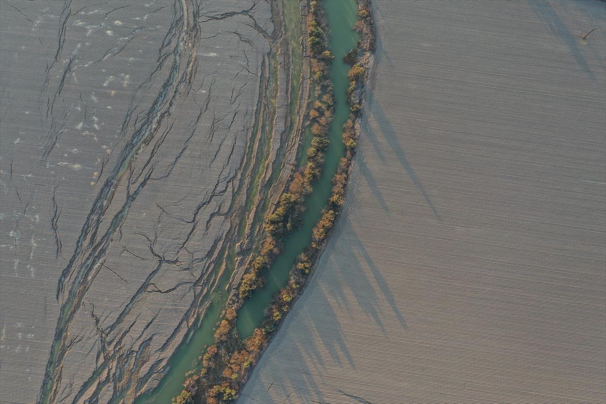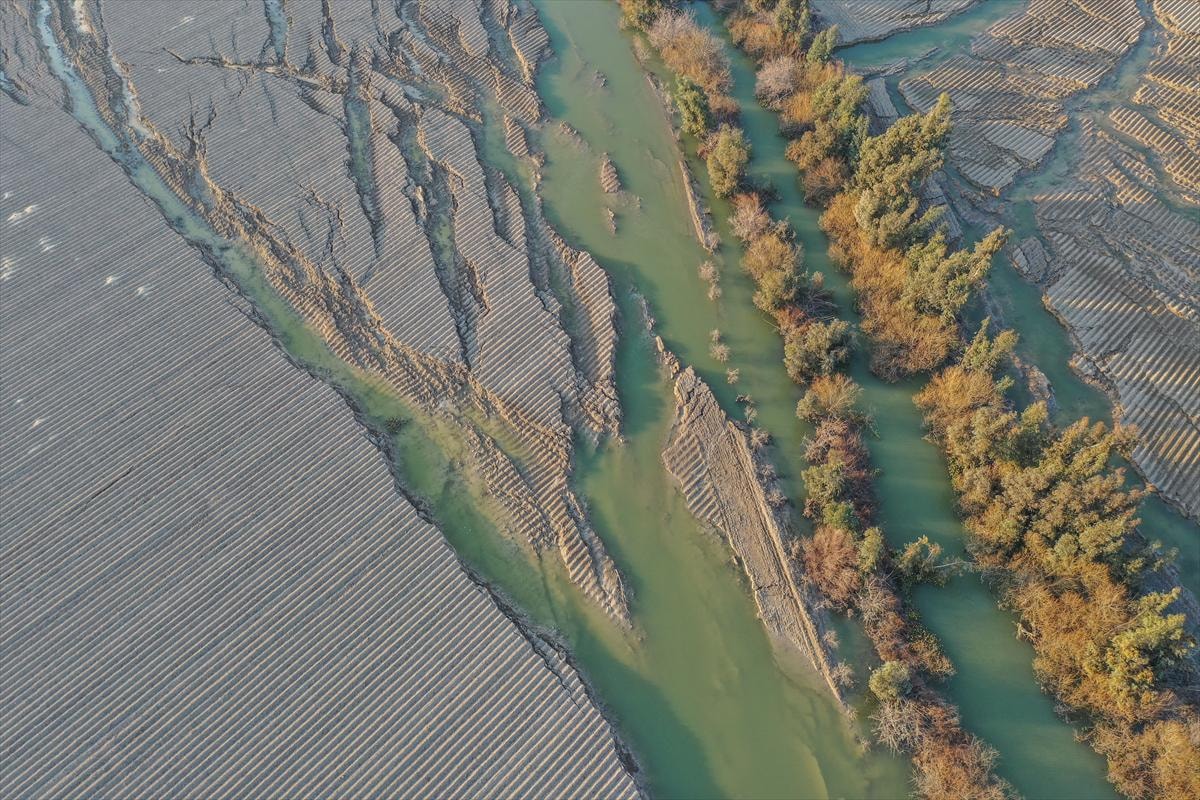 Yaklaşık 2 metreyle derinliği insan boyuna oluşan yarıkların yanı sıra bölgedeki bir tarlada meydana gelen çatlaklar da drone'la görüntülendi.