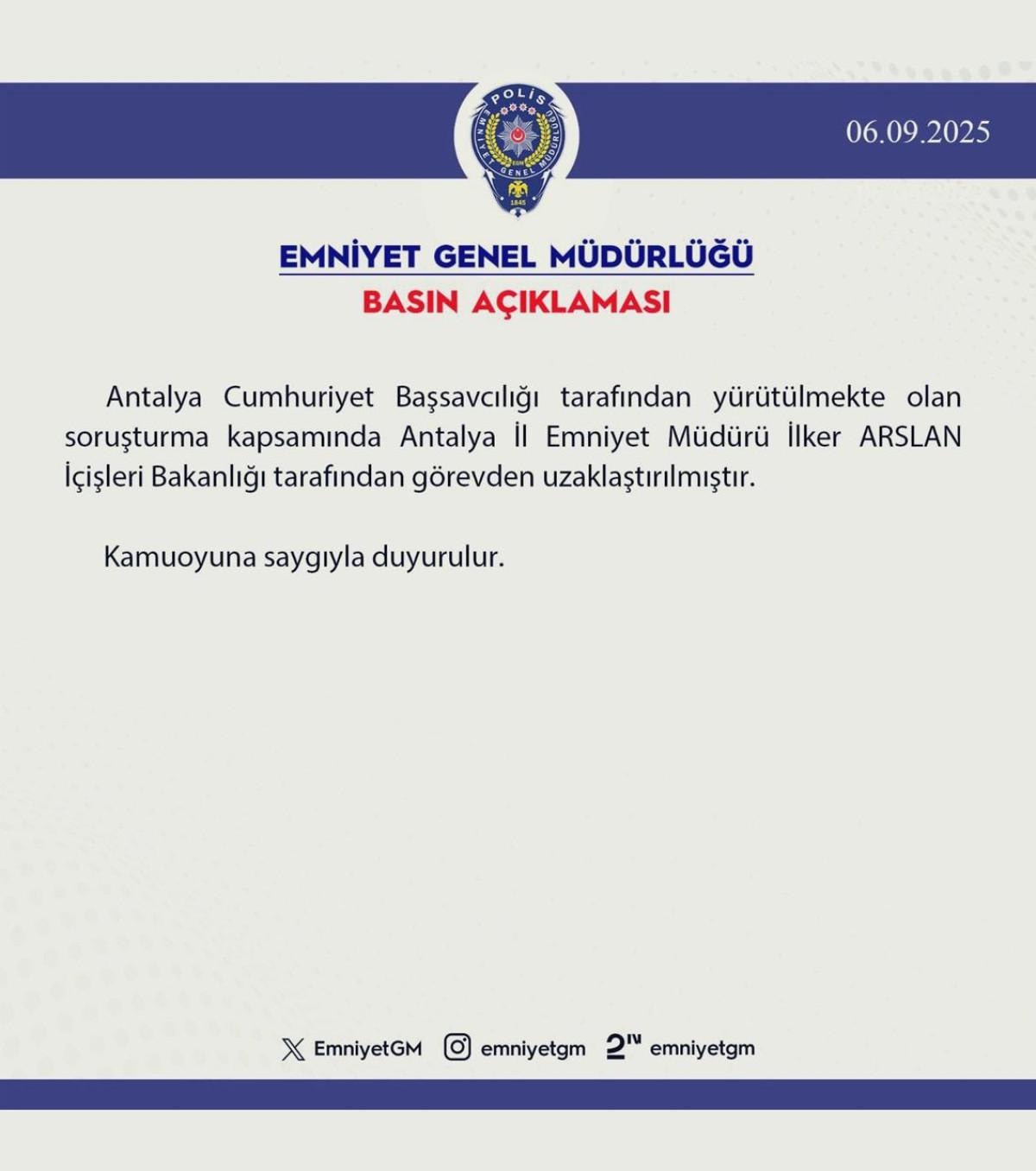 Emniyet Genel Müdürlüğü'nden yapılan açıklamada "Antalya Cumhuriyet Başsavcılığı tarafından yürütülmekte olan soruşturma kapsamında Antalya İl Emniyet Müdürü İlker Arslan, İçişleri Bakanlığı tarafından görevden uzaklaştırılmıştır." denildi.