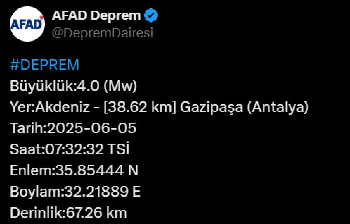 Antalya'nın Gazipaşa ilçesine 38.62 kilometre uzaklıktaki depremin 67.26 kilometre derinlikte meydana geldiği belirlendi.
