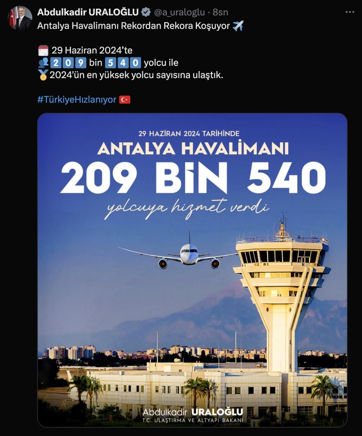 Bakan Uraloğlu, söz konusu tarihte Antalya Havalimanı’nda, 189 bin 508’i dış hat, 20 bin 32’si iç hat olmak üzere toplam 209 bin 540 yolcuya hizmet verebildiği bilgisini de paylaşırken, bu tarihin 2024 yılının en yüksek yolcu sayısı olduğunun altını çizdi.