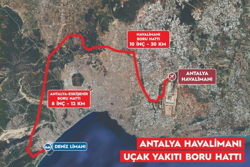 Uraloğlu, Antalya Havalimanının Kapasite Artırımına Yönelik İlave Yatırımlar kapsamında, havalimanında bulunan uçak yakıtı depolarının bağlantıları tamamlanarak havalimanına hizmet verecek boru hattının devreye alındığını ifade ederek, “Bu sayede uçak yakıtı olan Jet A1 yakıtı Antalya Deniz Terminalinde bulunan akaryakıt depolarından, 40 kilometre boru hattı aracılığıyla havalimanımıza transferi gerçekleştirilecek.” dedi.