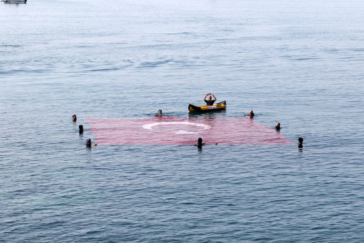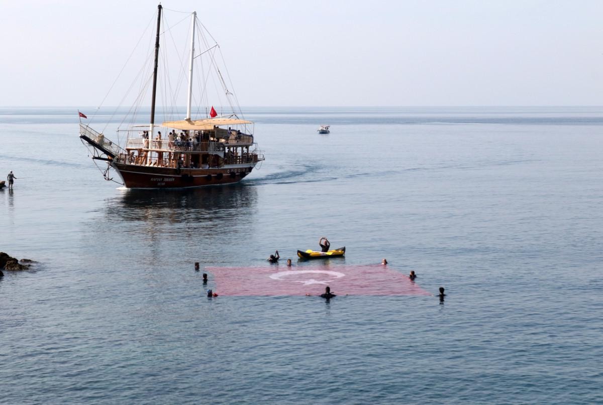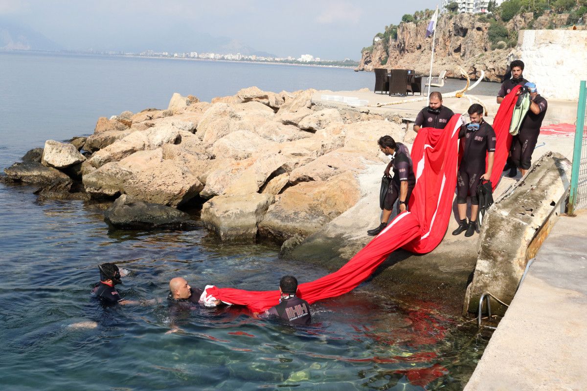 Kıyıdan yaklaşık 15 metre açığa giden dalgıçlar, Türk bayrağını açtı.