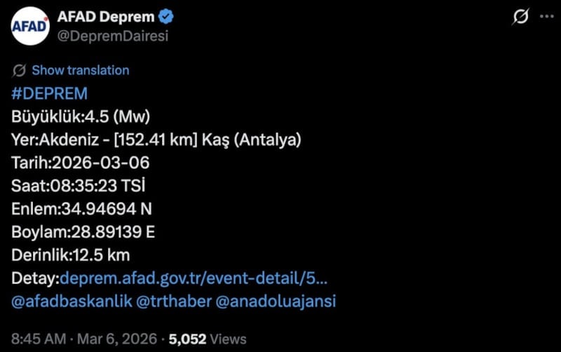 AFAD sosyal medya platformu X hesabından yaptığı paylaşımda kayda geçen sarsıntının Kaş açıklarında olduğunu aktardı.
