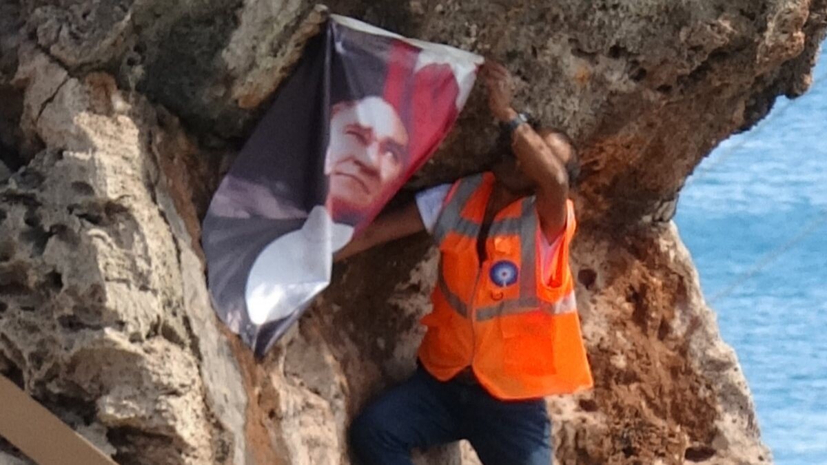 Denize düşme tehlikesine aldırış etmeden kayaların üzerine çıkan Doğan, yaklaşık 40 dakika boyunca posteri kayaya bağlamaya çalıştı.