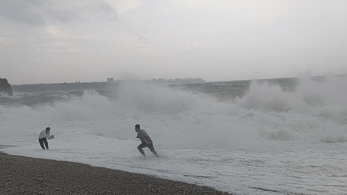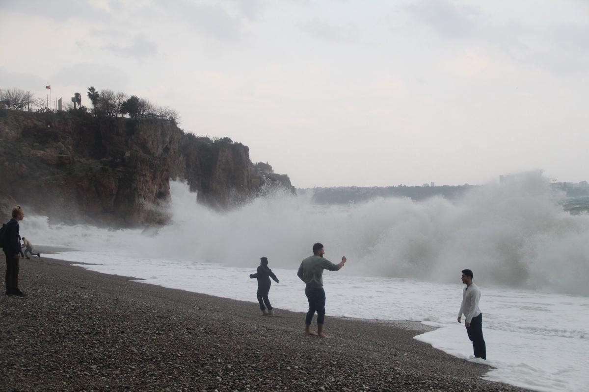 Bazı turistler su altında kalan kayalık alandan dalgaları izledi, bazı vatandaşlar ise öz çekim yaptı.