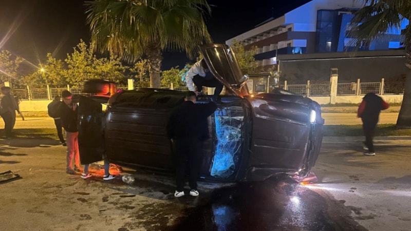 Manavgat'ta palmiyeye çarpan lüks araç devrildi, vatandaşlar yardıma koşarken bazı otel müşterileri olan biteni sinema sahnesi izler gibi seyretti.