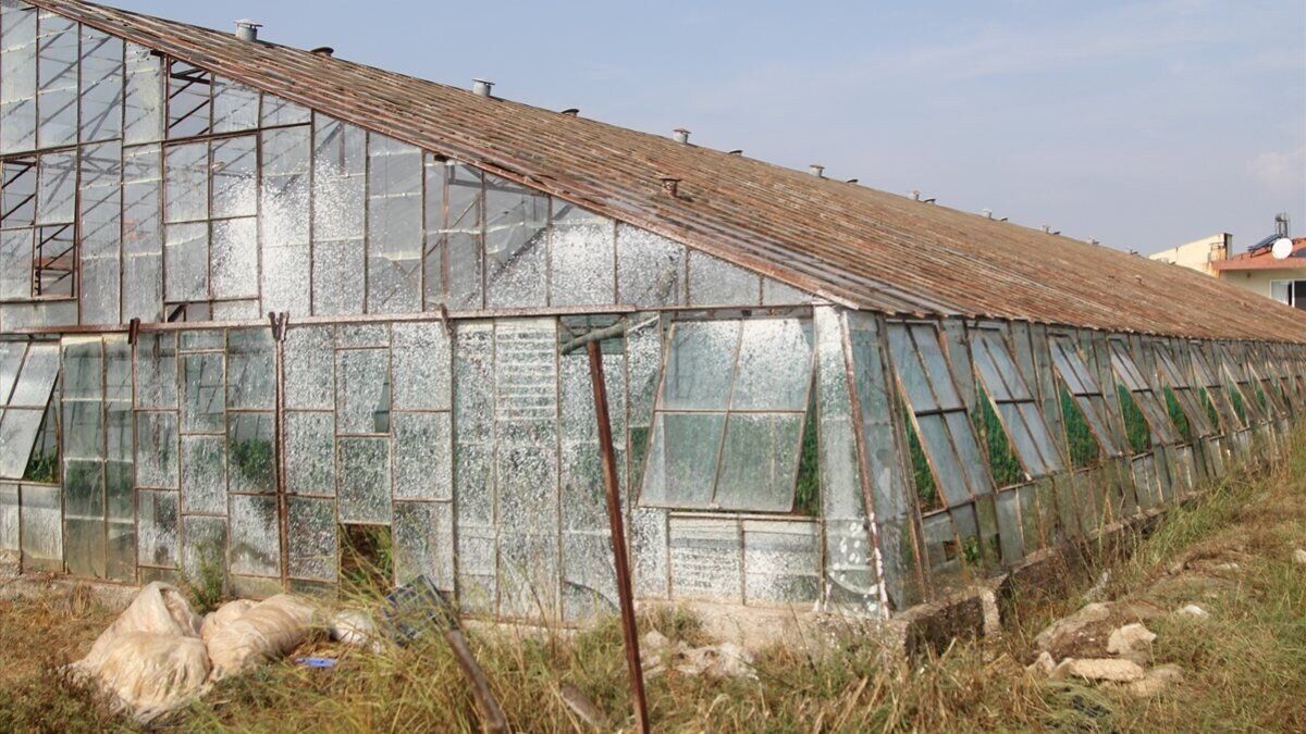 Dolu yağışının ardından 40 dekar cam seranın camları yerle bir oldu. Seralarda bulunan biber, patlıcan ve domates fideleri zarar gördü.