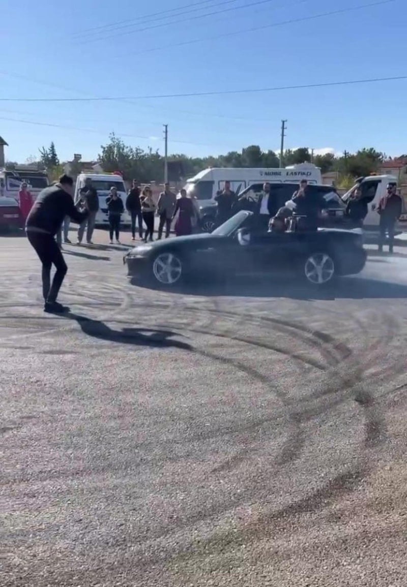 2918 Sayılı Karayolları Trafik Kanunu'nun 116. maddesince 5 araca toplam 161 bin 165 TL para cezası uygulandı. Görüntülerde lüks araçlarla atılan drift sırasında bir araçta gelin ve damadın da olduğu görüldü. Damadın araca drift attırırken gelinin elindeki buketi sallaması dikkat çekti.