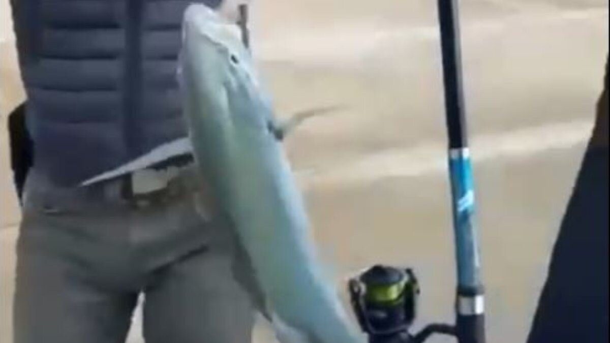 Oltayı kontrol etmekte olan gence yanındaki arkadaşı yardım ederek balığın kıyıya çekilmesi sağlandı.