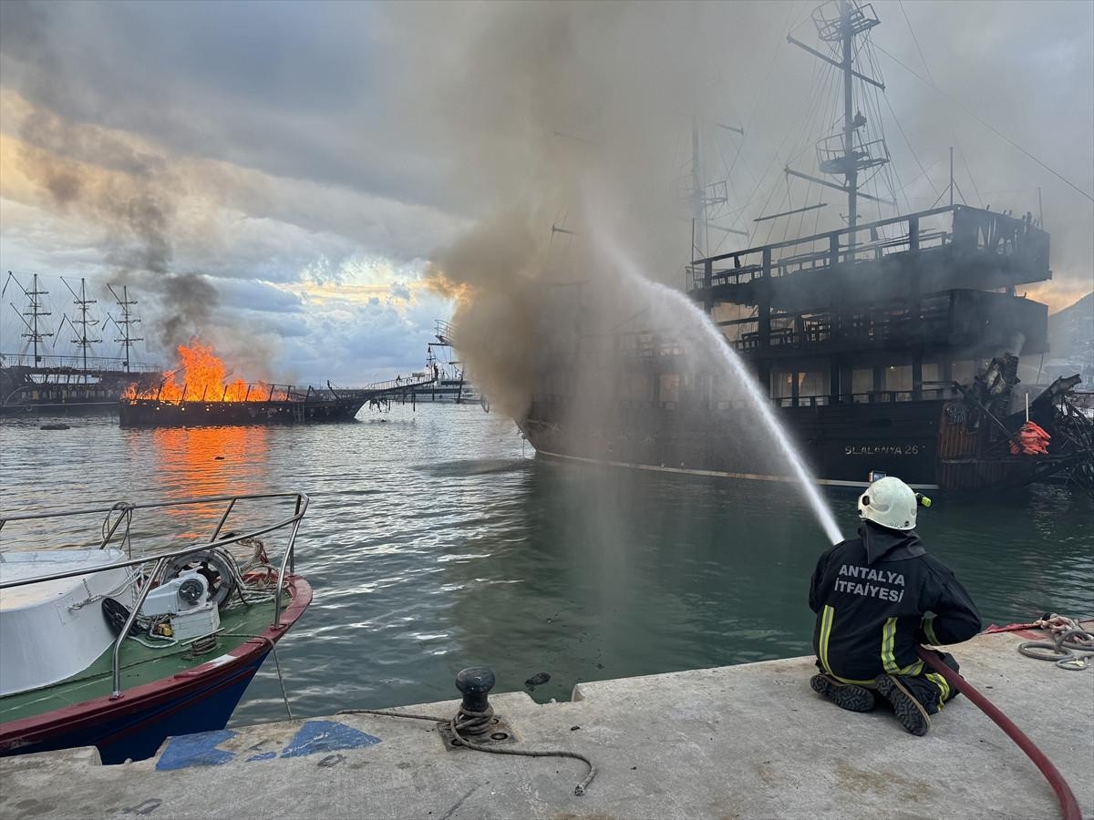 Alanya Balıkçı Barınağı'nda demirli bir tur teknesinde, henüz bilinmeyen bir nedenle yangın çıktı.