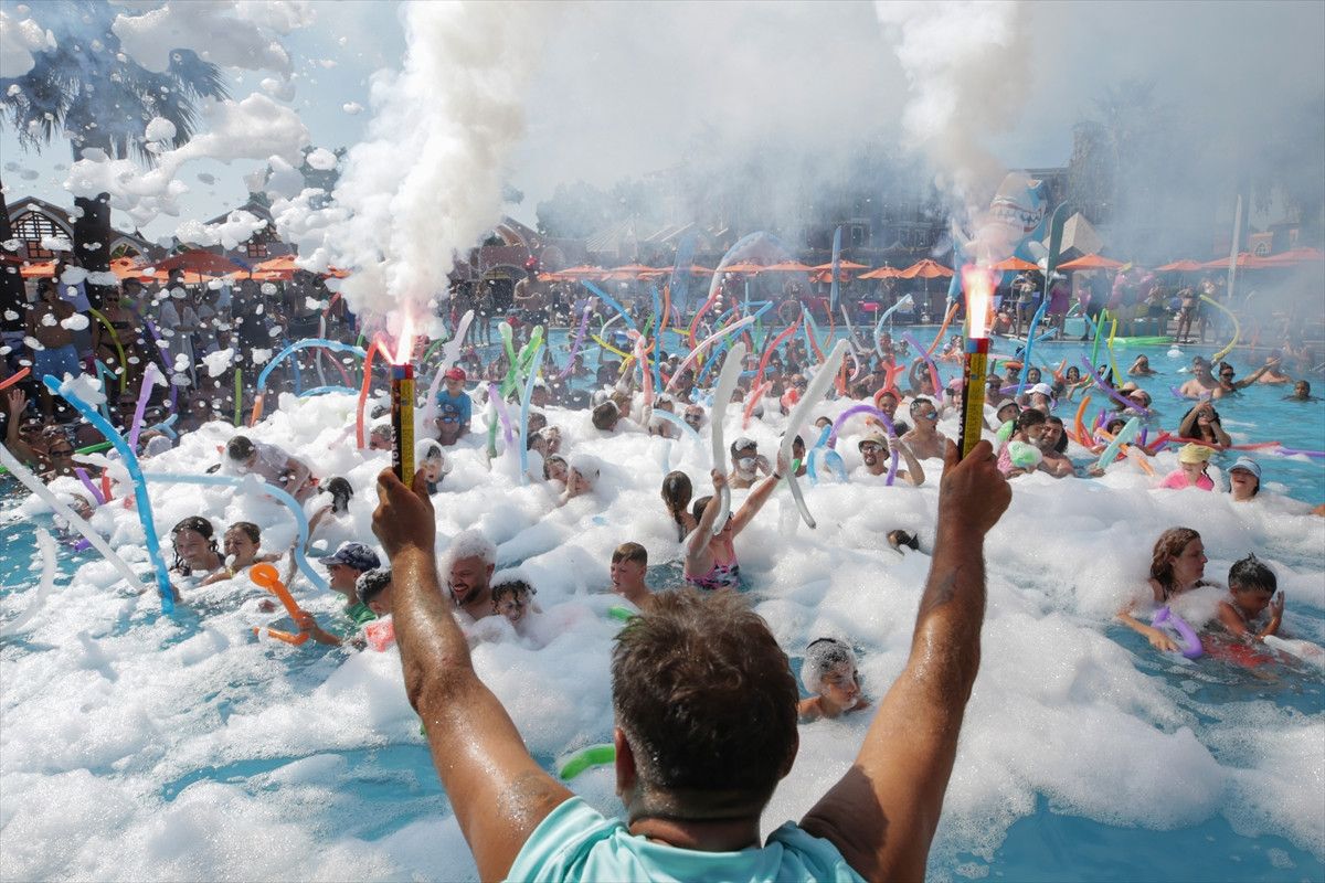 Havuzda ve çevresinde toplanan kalabalıkla birlikte renkli görüntülerin oluştuğu etkinlikte, tatilciler buz kalıplarıyla doyasıya eğlenirken, bir yandan da serinledi.