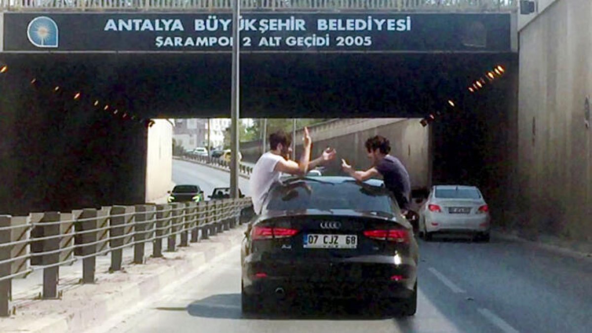 İçinde 4 kişinin bulunduğu lüks otomobilin sürücüsü trafikte makas atarak ilerlerken, arkada oturan 2 genç, açık bulunan pencerelerden çıkıp, kapıya oturdu. Gençler tehlikeye aldırış etmeden 'taş, kağıt, makas' oynadı.
