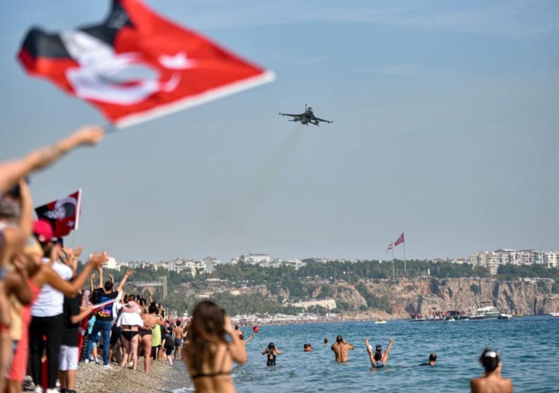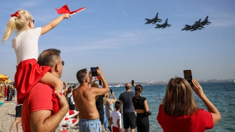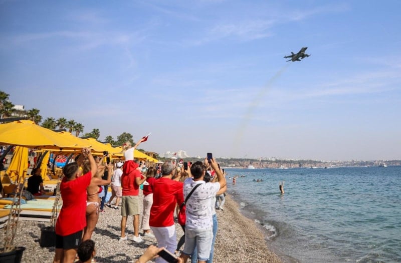 Antalya'da Cumhuriyet'in 100. yıl dönümü dolayısıyla F-16 savaş uçakları gösteri uçuşu gerçekleştirdi. Konyaaltı Sahili'nde yapılan uçuşa vatandaşlar yoğun ilgi gösterdi.