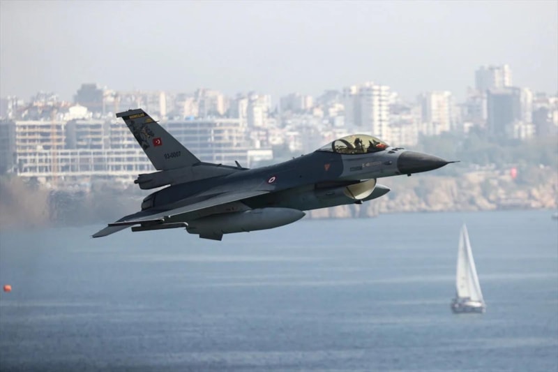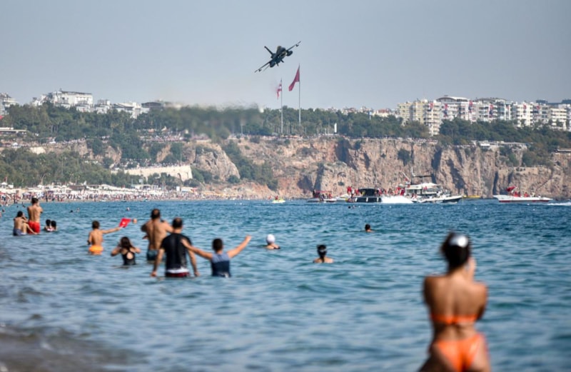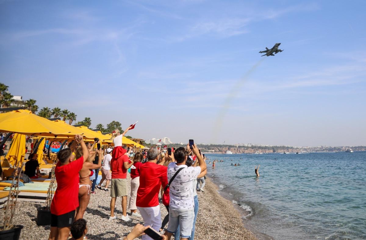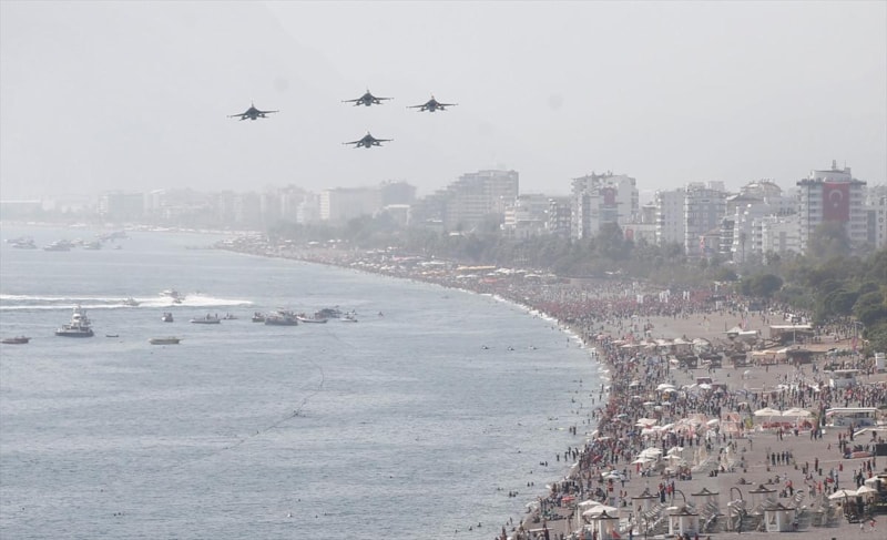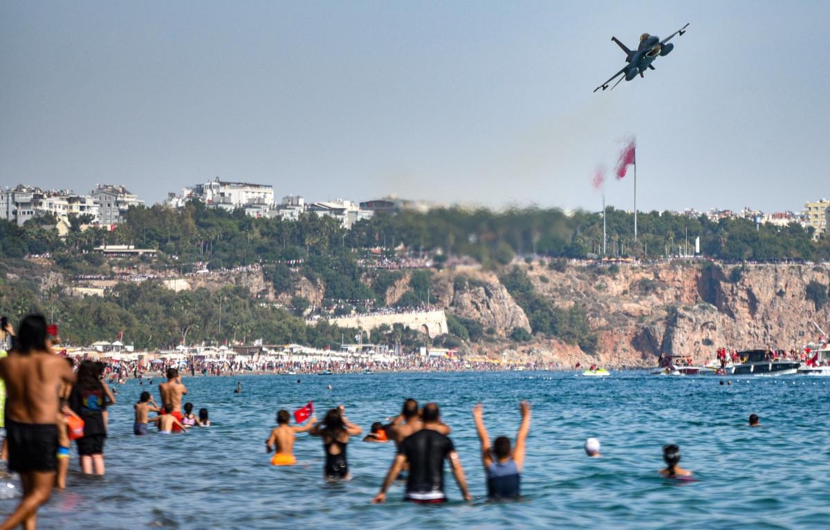 4 adet F-16 savaş uçağı Konyaaltı Sahili ve falezler üzerinde uçarak özel bir şov gerçekleştirdi.