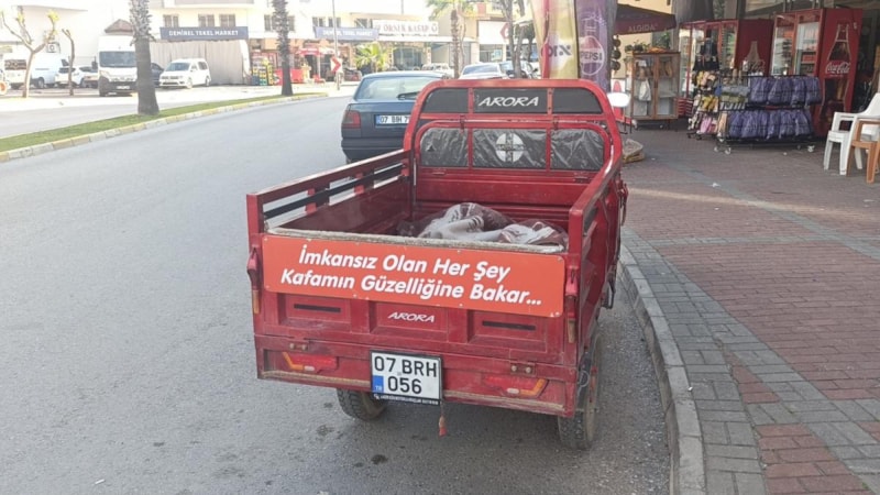 Kazada hasar gören üç tekerli motosikletin arka kısmında yazan cümle dikkat çekti: “İmkansız olan her şey kafamın güzelliğine bakar.”