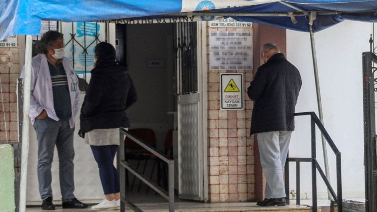 Antalya'nın Muratpaşa ilçesine bağlı Yüksekalan Mahallesi'nde 30 No'lu M. İhsan Oğul Aile Sağlığı Merkezi'ne giden hastalar, dışarıda muayene ediliyor.