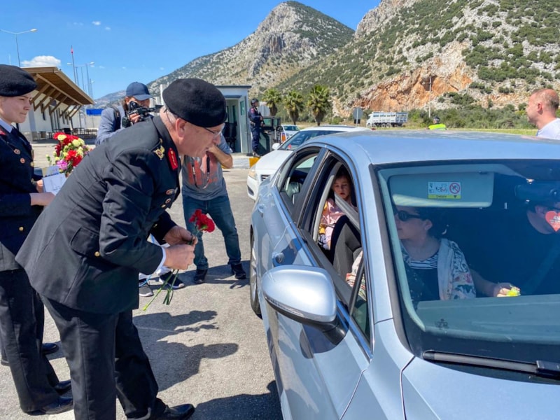 Uygulamada Antalya İl Jandarma Komutanı Tuğgeneral Tarık Hekimoğlu da sürücülere hem iyi yolculuklar diledi hem de çiçek vererek bayramlarını tebrik etti.