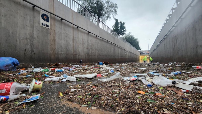 Alt geçitte biriken suyun seviyesinin bir miktar azalmasının ardından geride çöp ve duvardaki izi kaldı.