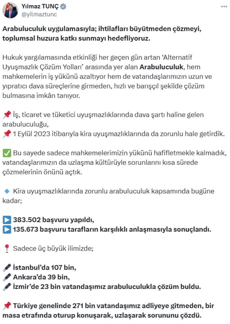 Sosyal medya hesabından açıklama yapan Bakan Tunç, "Türkiye genelinde 271 bin vatandaşımız adliyeye gitmeden, bir masa etrafında oturup konuşarak, uzlaşarak sorununu çözdü" dedi.
