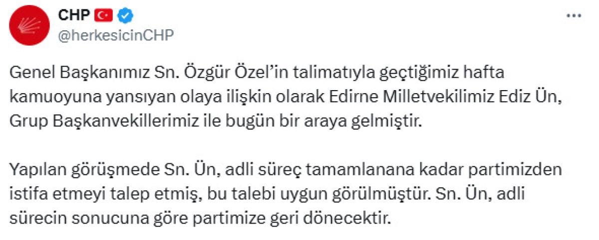 CHP Genel Başkanı Özgür Özel, Edirne Milletvekili Ediz Ün'ün istifasını istedi.