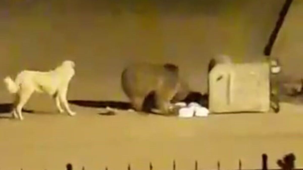 Bölgede bulunan köpeklerin de gelmesiyle çöp konteynerini sahiplenen ayı, köpeklerin yaklaşmasına izin vermedi.
