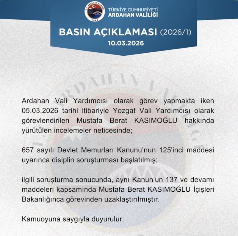 Ardahan Vali Yardımcısı olarak görev yapmakta iken 05.03.2026 tarihi itibariyle Yozgat Vali Yardımcısı olarak görevlendirilen Mustafa Berat Kasımoğlu hakkında yürütülen incelemeler neticesinde; 657 sayılı Devlet Memurları Kanunu'nun 125'inci maddesi uyarınca disiplin soruşturması başlatılmış; ilgili soruşturma sonucunda, aynı Kanun'un 137 ve devamı maddeleri kapsamında Mustafa Berat Kasımoğlu İçişleri Bakanlığınca görevinden uzaklaştırılmıştır. Kamuoyuna saygıyla duyurulur.