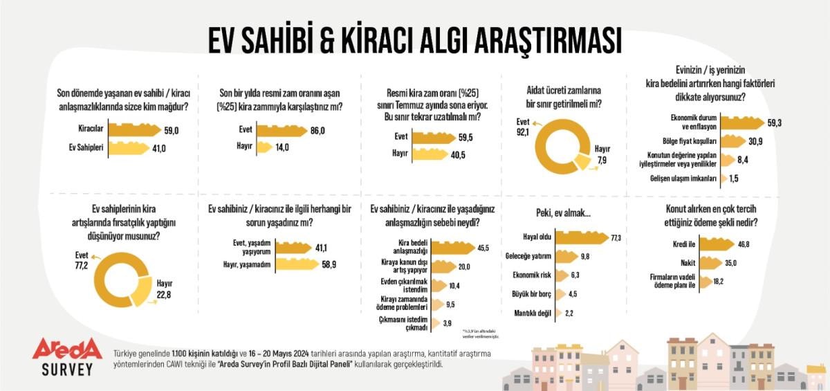Türkiye genelinde 1.100 kişinin katılımıyla gerçekleşen araştırmaya göre; kiracı / ev sahibi tartışmalarında halkın yüzde 59’u kiracıların, yüzde 41’i de ev sahiplerinin mağdur olduğunu düşünüyor.