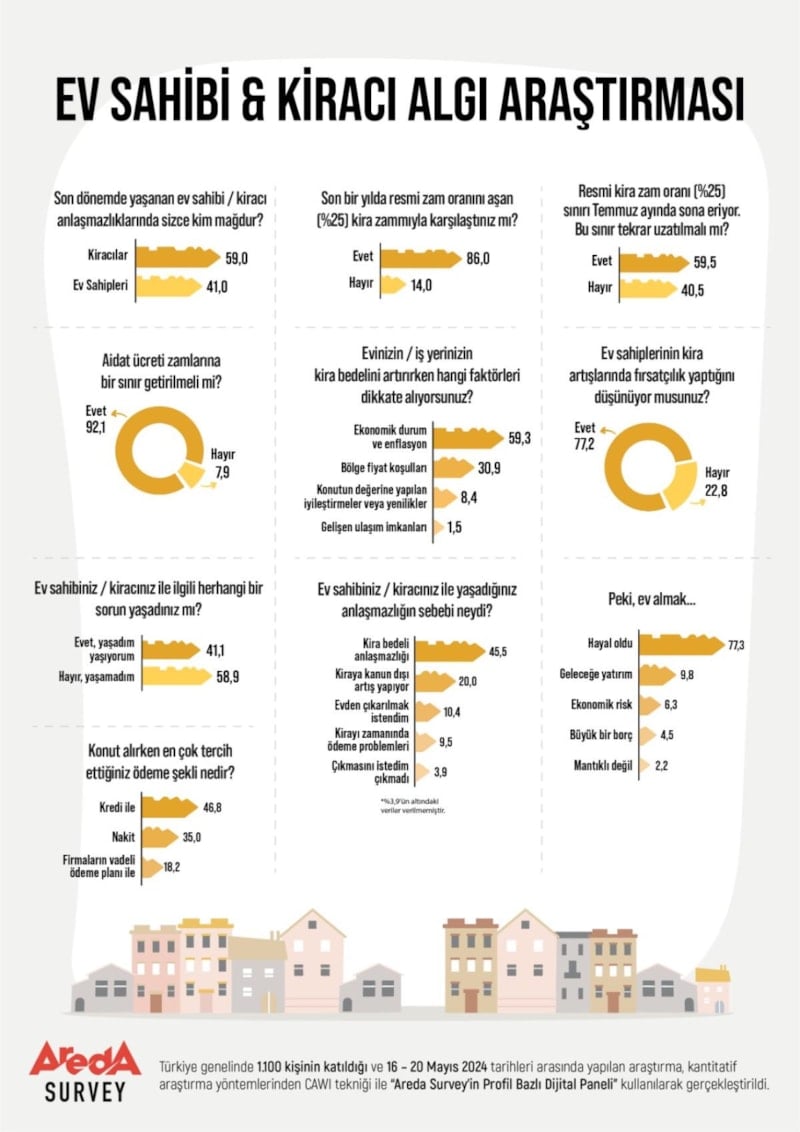 Areda Survey araştırma şirketinin anketine göre kiracıların yüzde 86’sı, son bir yılda resmi zam oranı olan yüzde 25'ten fazla oranlarla kiralarına zam yaparken halkın yüzde 59,5’i yüzde 25 zam sınırı kararının uzatılmasını istiyor.