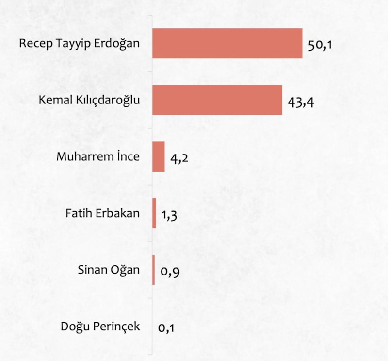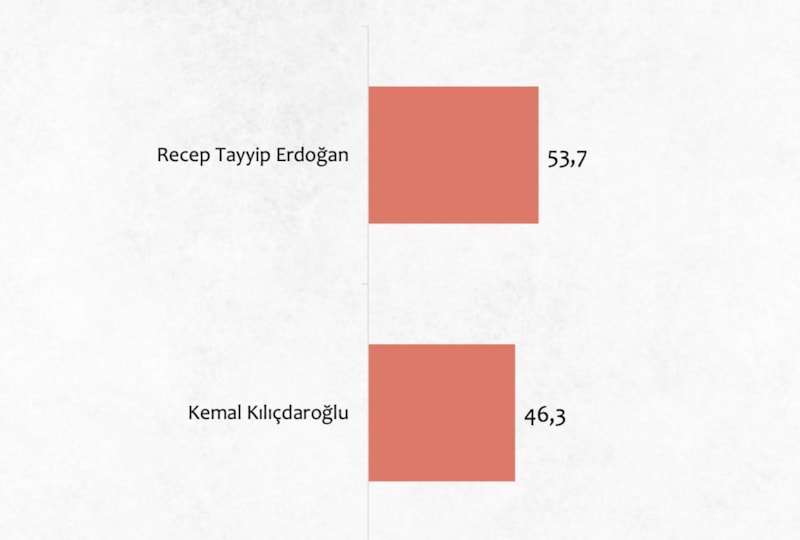 İkinci turda Recep Tayyip Erdoğan'a oy veririm diyenlerin oranı 53,7 olurken Kemal Kılıçdaroğlu ise 46,3 oranında kaldı.