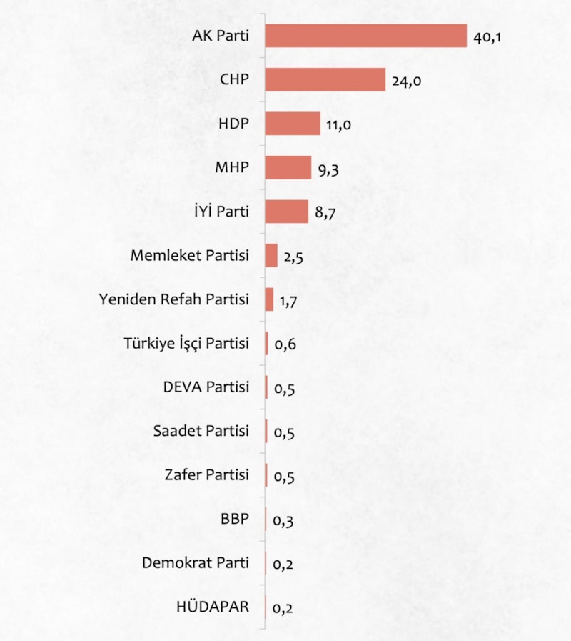 Anketten çıkan sonuca göre AK Parti yüzde 40,1, CHP 24,0 ve HDP ise 11 ile ilk üç sırada yer aldı.