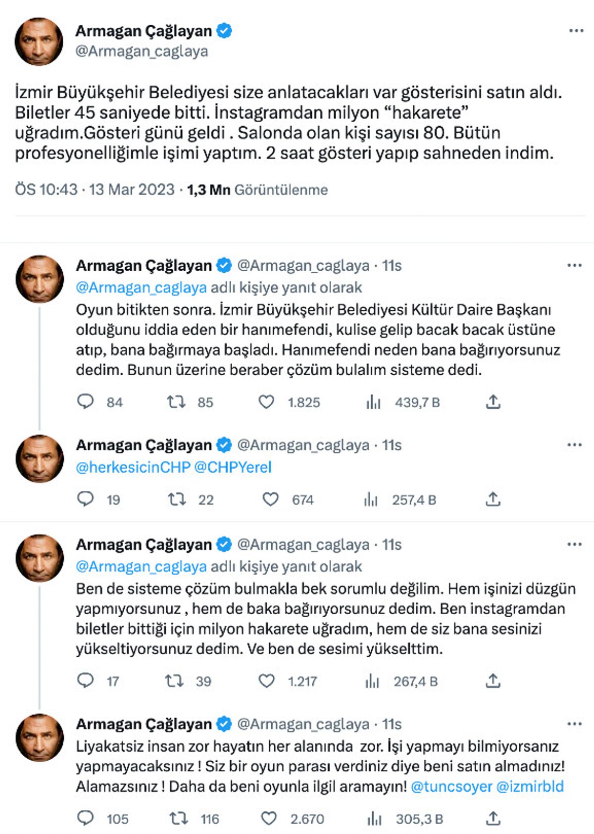 Instagram'dan milyon 'hakarete' uğradım. Gösteri günü geldi. Salonda olan kişi sayısı 80. Bütün profesyonelliğimle işimi yaptım. 2 saat gösteri yapıp sahneden indim. Oyun bitikten sonra. İzmir Büyükşehir Belediyesi Kültür Daire Başkanı olduğunu iddia eden bir hanımefendi, kulise gelip bacak bacak üstüne atıp bana bağırmaya başladı. 'Hanımefendi neden bana bağırıyorsunuz' dedim. Bunun üzerine 'Beraber çözüm bulalım sisteme' dedi. Ben de 'Sisteme çözüm bulmakla ben sorumlu değilim. Hem işinizi düzgün yapmıyorsunuz hem de bana bağırıyorsunuz' dedim.