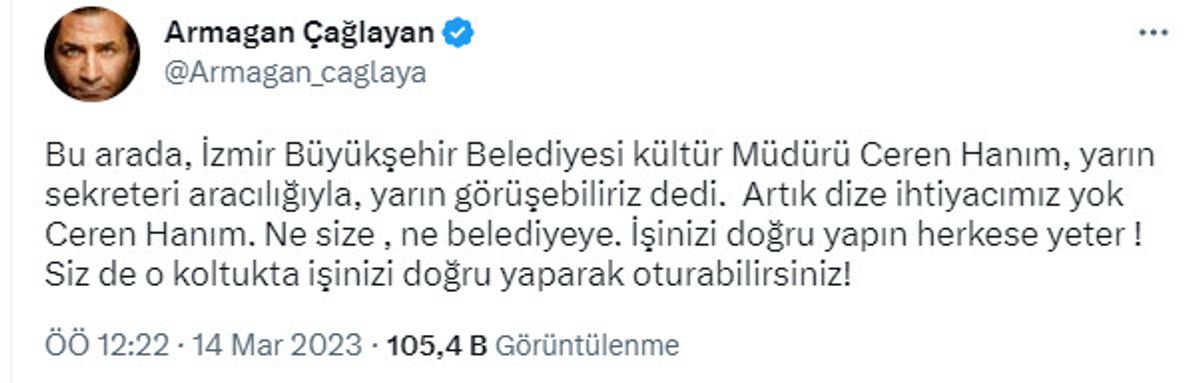 Bu arada, İzmir Büyükşehir Belediyesi Kültür Müdürü Ceren Hanım, yarın sekreteri aracılığıyla, 'yarın görüşebiliriz' dedi. Artık size ihtiyacımız yok Ceren Hanım. Ne size, ne belediyeye. İşinizi doğru yapın herkese yeter! Siz de o koltukta işinizi doğru yaparak oturabilirsiniz!
