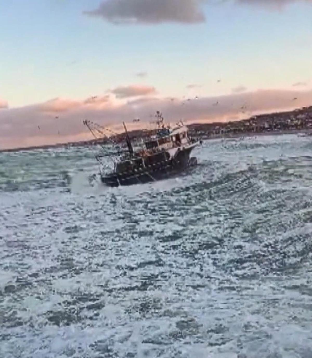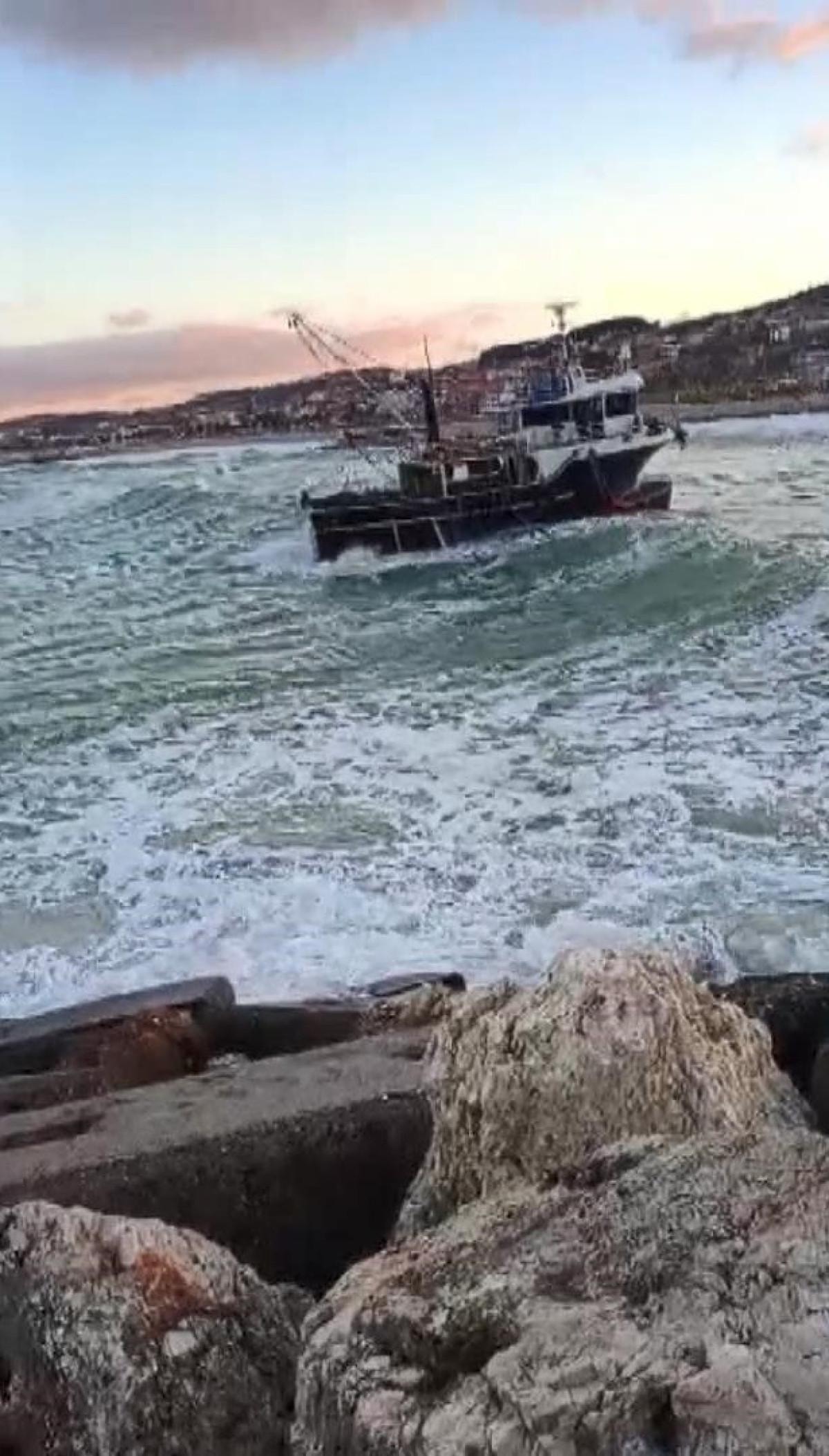 Dalgalar arasında alabora olmaktan son anda kurtulan balıkçı teknesi limana yanaşmak için hızlandığı sırada bir kez daha tehlike atlattı.
