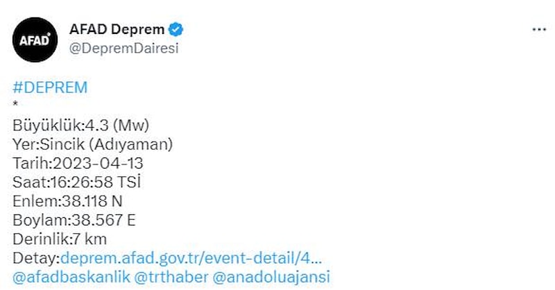 Adıyaman'da saat 16.26'da yerin 7 kilometre derinliğinde 4.3 büyüklüğünde bir deprem meydana geldi.