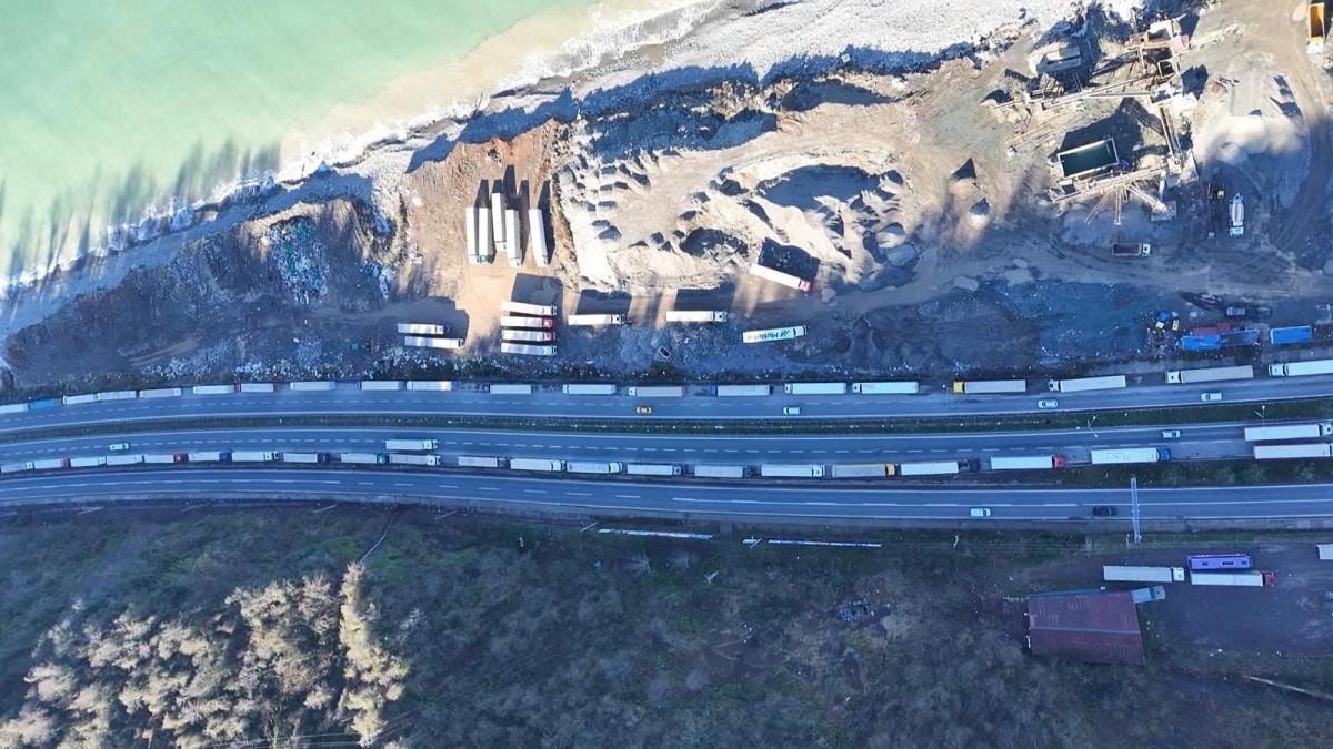 Türkiye'nin Kafkaslar ve Orta Asya'ya açılan kapısı Sarp Sınır Kapısı'nda geçiş yapmak için sıra bekleyen tırlar, Artvin'in Hopa ilçesinde uzun bir kuyruk oluşturdu.