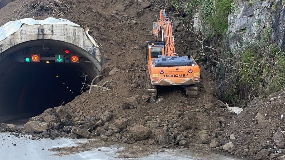 Tünel üzerinde bulunan yamaçtan kopan toprak ve kaya parçaları, tünel girişini kapattı.