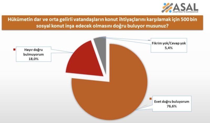 Asal Araştırma, vatandaşlara "Hükümetin dar ve orta gelirli vatandaşların konut ihtiyaçlarını karşılamak için 500 bin sosyal konut inşa edecek olmasını doğru buluyor musunuz?" sorusunu sordu.