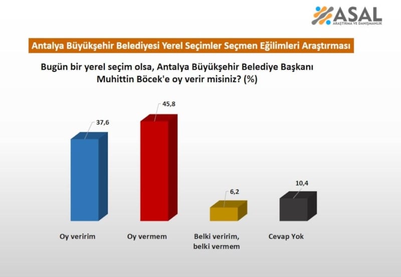 Ankette seçmenlere, "Antalya Büyükşehir Belediye Başkanı Muhittin Böcek tekrar aday olsa oy verir misiniz?" sorusu da yöneltildi.