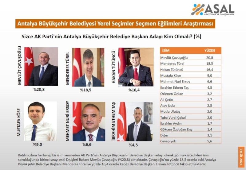 ASAL Araştırma'nın Antalya'da yaptığı ankette katılımcıların yüzde 20,8'i, Antalya Büyükşehir Belediye Başkan Adayı olarak eski Dışişleri Bakanı Mevlüt Çavuşoğlu'nu görmek istediklerini söyledi.