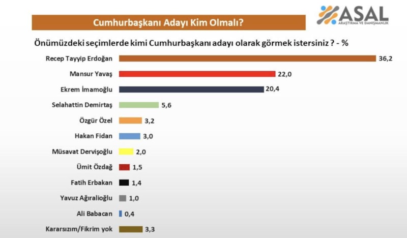 Asal Araştırma'nın katılımcılara herhangi bir isim vermeden Cumhurbaşkanı adayı olarak görmek istedikleri ismi sorduğu araştırmada yüzde 36,2 ile ilk sırayı Cumhurbaşkanı Recep Tayyip Erdoğan aldı.