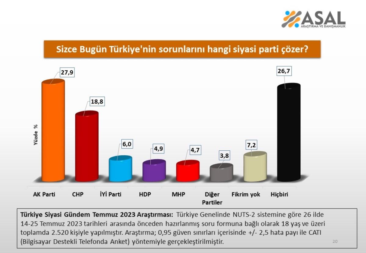 Aynı soruya yanıt verenlere ikinci olarak "Türkiye'nin sorunlarını hangi siyasi parti çözer?" sorusu yöneltildi. Bu soruya yanıt verenlerin yüzde 27.9'u tercihini AK Parti'den yana kullanırken, yüzde 26.7'lik kesim de Hiçbiri'den yana görüş bildirdi.