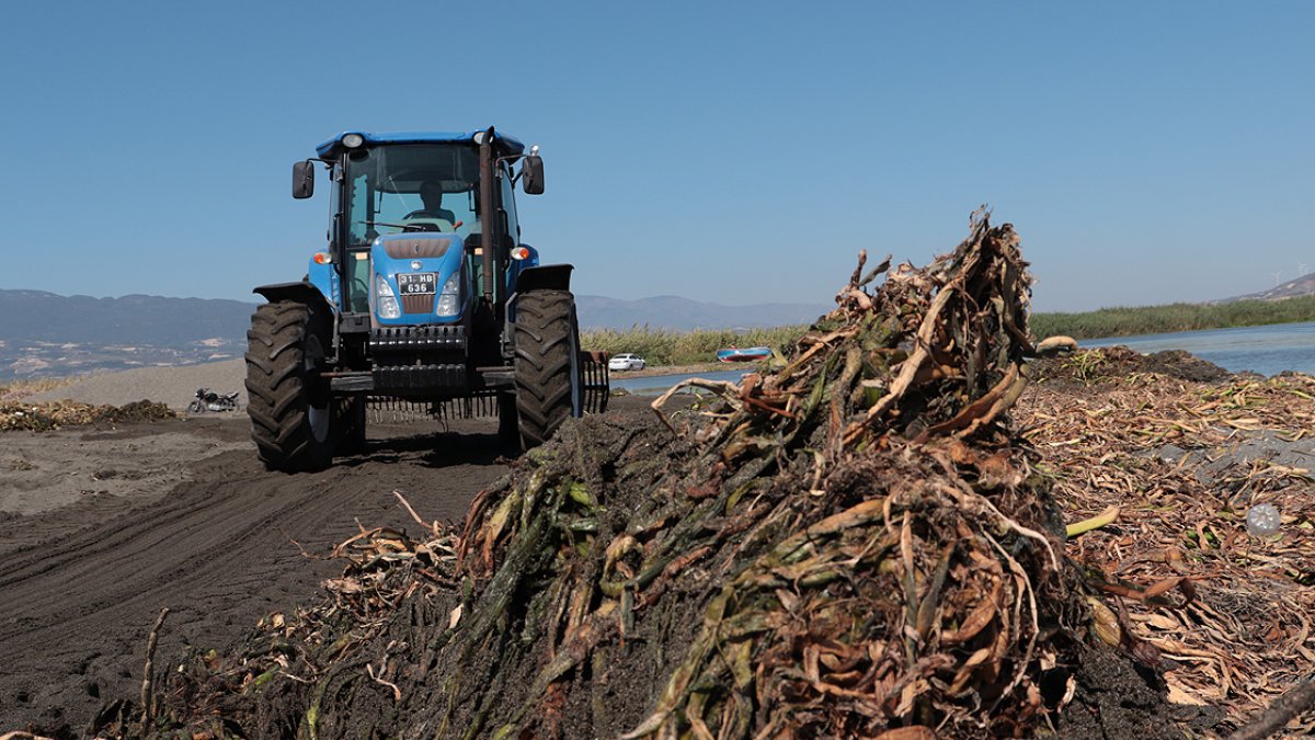 Hatay Büyükşehir Belediyesine bağlı temizlik ekipleri, traktör ve tırmıklarla sahili ve denizi kaplayan sümbülleri toplamayı sürdürüyor.