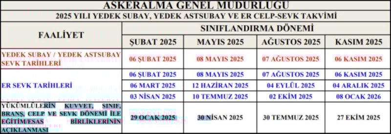 Askerlik hizmeti için 2025 yılı yedek subay, yedek astsubay ve er celp-sevk takvimi belirlendi.