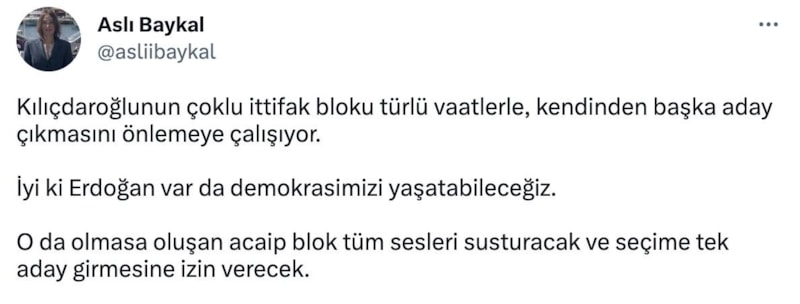 Kemal Kılıçdaroğlu'nun adaylığını eleştiren Aslı Baykal paylaşımında, Cumhurbaşkanı Erdoğan'a övgü dolu sözler sarf etti.