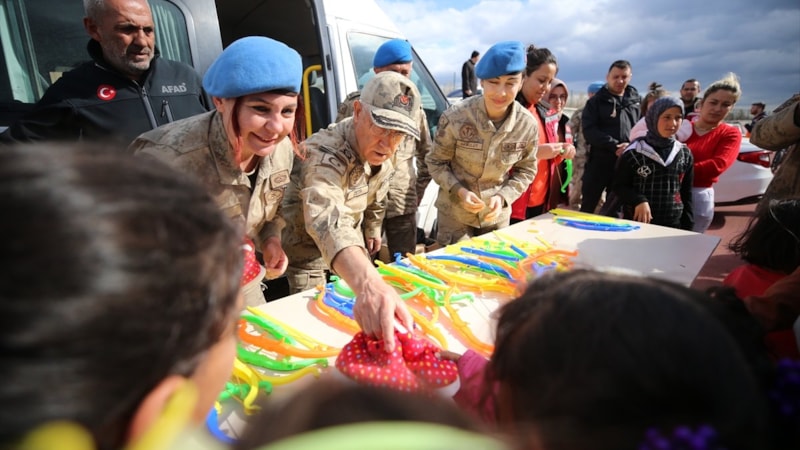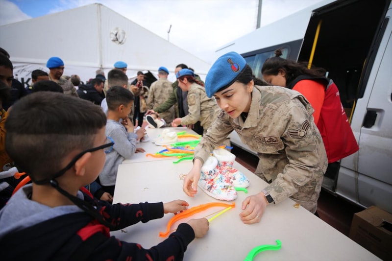 Mehmetçik, çocuklara oyuncak hediye ederek minik depremzedelerin yüzünü güldürdü.