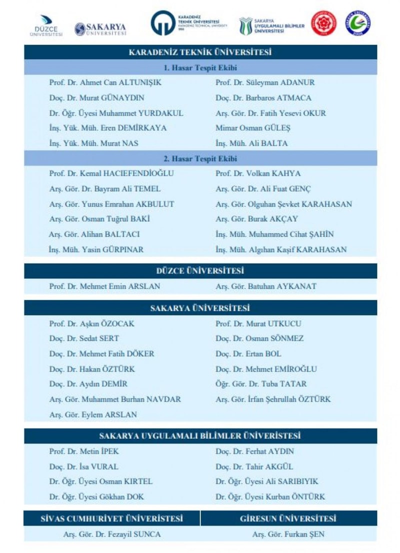 11 ili etkileyen yıkıcı depremlerin ardından Karadeniz Teknik Üniversitesi, Düzce Üniversitesi, Sakarya Üniversitesi, Sakarya Uygulamalı Bilimler Üniversitesi, Sivas Cumhuriyet Üniversitesi ve Giresun Üniversitesi'nden bilim insanları bir araya geldi, deprem bölgelerinde saha araştırması yaptı.