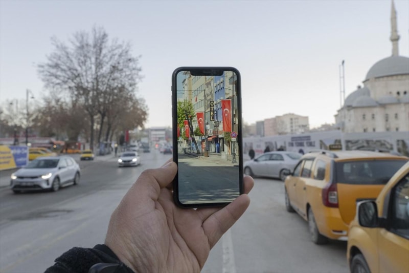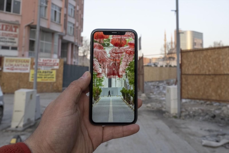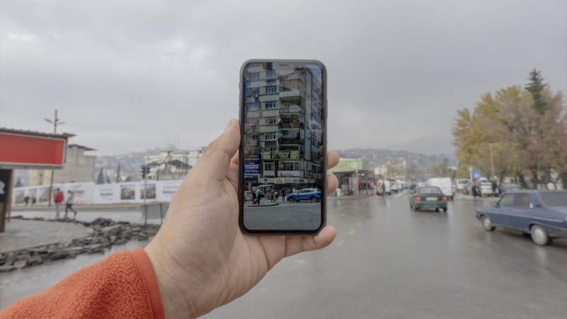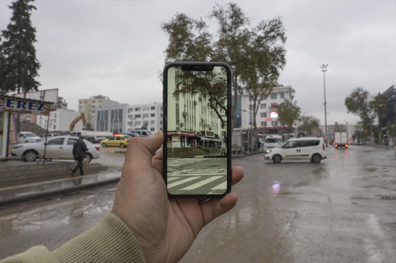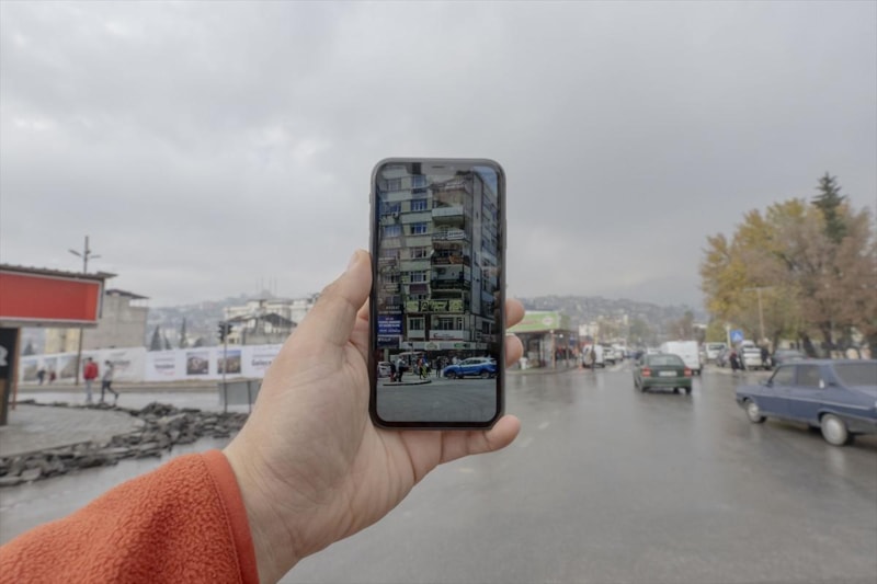 Hatay'da arşivdeki fotoğrafların, cep telefonu ekranına bir bölümü yansıtılarak tekrar fotoğraflandığı projede asrın felaketinin izleri görülüyor.