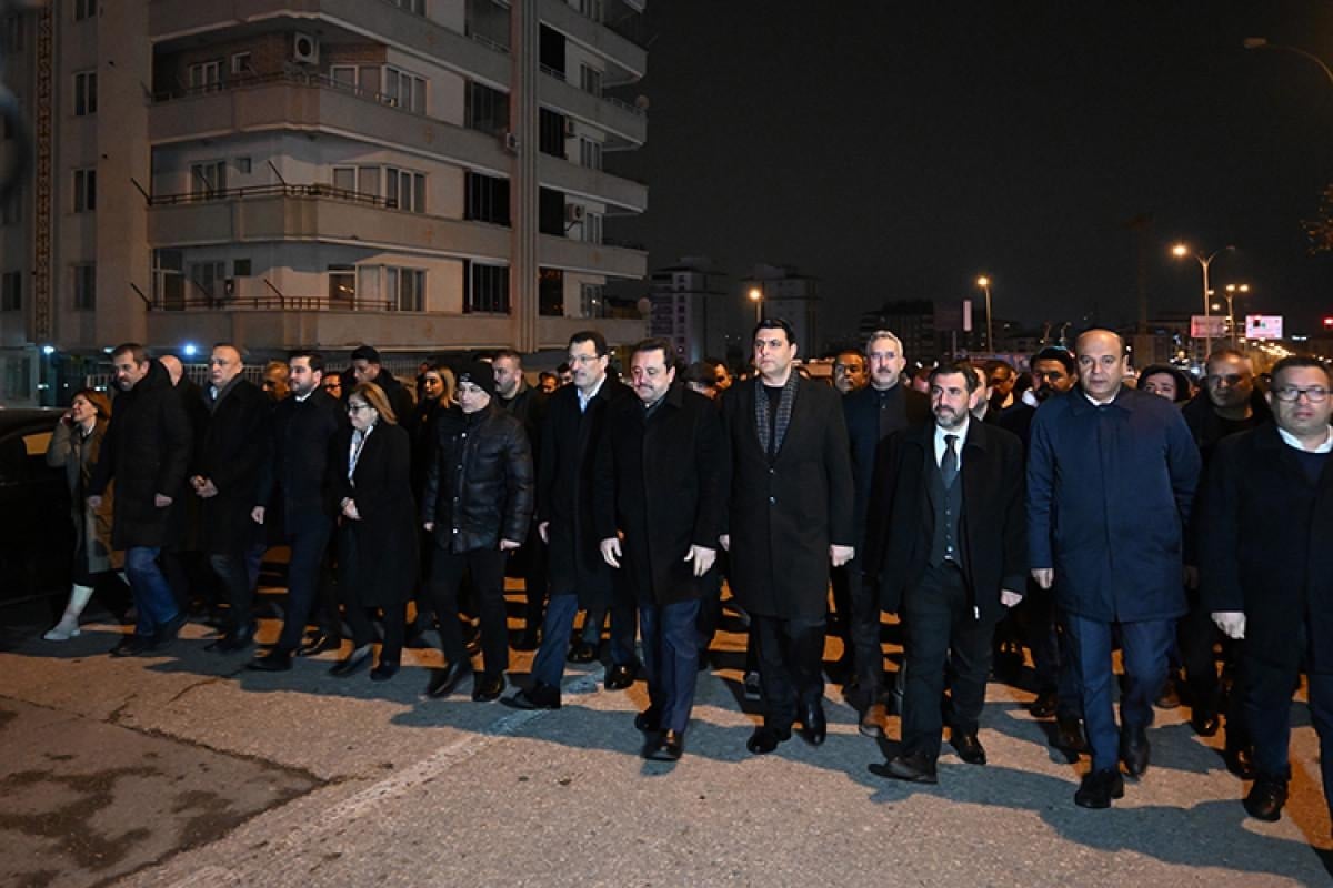 Taziyeevinde toplanan Gaziantep Valisi Kemal Çeber, AK Parti Genel Başkan Yardımcısı Ali İhsan Yavuz, CHP Genel Başkan Yardımcısı Aylin Nazlıaka, Büyükşehir Belediye Başkanı Fatma Şahin, milletvekilleri ve yakınlarını kaybeden vatandaşlar enkaz alanına yürüdü.